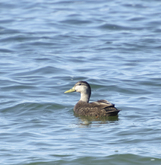 Males in breeding plumage have a buffy head that is heavily streaked with black, especially through the eye and on the tip of the head. The upperparts, including the tail and wing are blackish brown. The underparts feathers are dark sooty brown, with pale reddish and buff margins. The secondaries are iridescent blueish purple, with a black subterminal border and a narrow white tip, sometimes not present. The tertials are glossy black next to the speculum, but otherwise are gray to blackish brown, and the underwing surface is silvery white. The iris is brown, the bill is greenish yellow to bright yellow, with a black nail, and the feet and legs are orange red. Females also have a greenish to olive-colored bill, with small black spotting, and dusky to olive-colored legs and feet. Juveniles resemble adults, but are more heavily streaked on the breast and underparts, since these feathers have broader buff margins but darker tips. In the field the Black Duck has a body shaped like a Mallard. In flight, Black Ducks appear to be nearly black, with an underwing coloration that is in contrast with the rest of their plumage (Johngard, 1978).