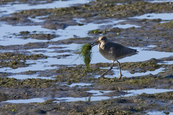 Willets are large, long-legged shorebirds. They are grey or brown overall and they have a distinctive white rump and broad, white wing stripe visible when they are flying. They are 33 to 41 cm long and from 200 to 330 grams. Sexes are similar in color, but females are slightly larger. There are two populations of willets that differ in distribution, ecology, and appearance. Western willets, which breed in western North America, are larger and paler, eastern willets, which breed in eastern North America, are slightly smaller and darker overall. The sounds they make and their habitats differ also. Their bill and legs are grayish, but vary from light to dark. The toes are slightly webbed.