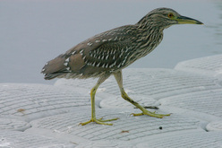 The night heron has a stocky body, with a comparatively short neck and legs. The length averages 58-72 cm, with the females averaging slightly smaller than the males. The adult has distinctive coloring, with black cap, upper back and scapulars; gray wings, rump and tail; and white to pale gray underparts. The bill is stout and black, and the eyes are red. For most of the year, the legs of the adult are yellow-green, but by the height of the breeding season, they have turned pink. The eyes of the juvenile black-crowned night heron are yellowish or amber, and the dull gray legs lack the colorful pigmentation of those of the adult. The juvenile has a brown head, neck, chest and belly streaked with buff and white. The wings and back are darker brown, though the tips of the feathers have large white spots. These spots are particularly large on the greater secondary coverts. The young do not acquire full adult plumage until the third year. (Davis, 1993; http://www.mbr.nbs.gov/id/htmid/h2020id.html)
