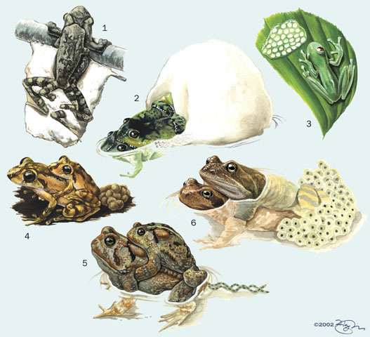 Anuran reproductive strategies: 1) rhacophorids create an arboreal foam nest; 2) Leptodactylus spp. create an aquatic foam nest; 3) a centrolenid with his clutch on the underside of a leaf, usually over a stream; 4) Eleutherodactylus creates a terrestrial clutch; 5) Bufo lays eggs in strings, one from each oviduct; 6) Rana lays a single, massive, aquatic clutch.