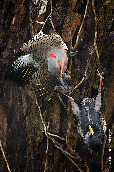 Northern flicker (Colaptes auratus) interacting with a starling (Sturnus vulgaris).