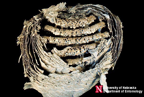 This is a cross-section of a yellowjacket nest. These are another kind of wasp. This species builds nests above ground. Others dig out nests underground, but they put the same kind of structure inside. (Dolichovespula arenaria, the Aerial Yellowjacket. Order Hymenoptera).