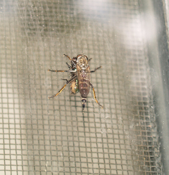 Bee killer (Promachus fitchii) with green bottle fly prey (Lucilla sericata)