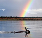 Caribou (Rangifer tarandus) crossing water.