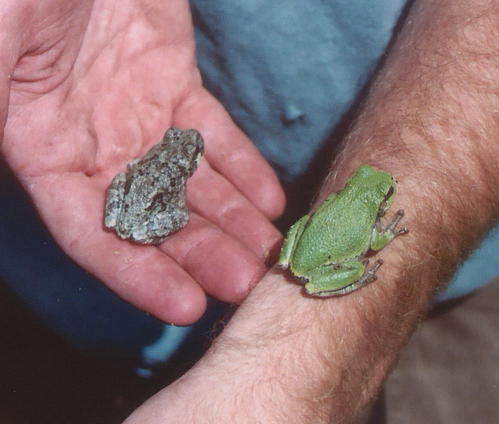 Color variation within Hyla versicolor and/or H. chrysoscelis. Individuals change color depending upon environmental conditions such as temperature and light levels. Hyla versicolor and H. chrysoscelis are indistinguishable except for their calls and chromosome number.