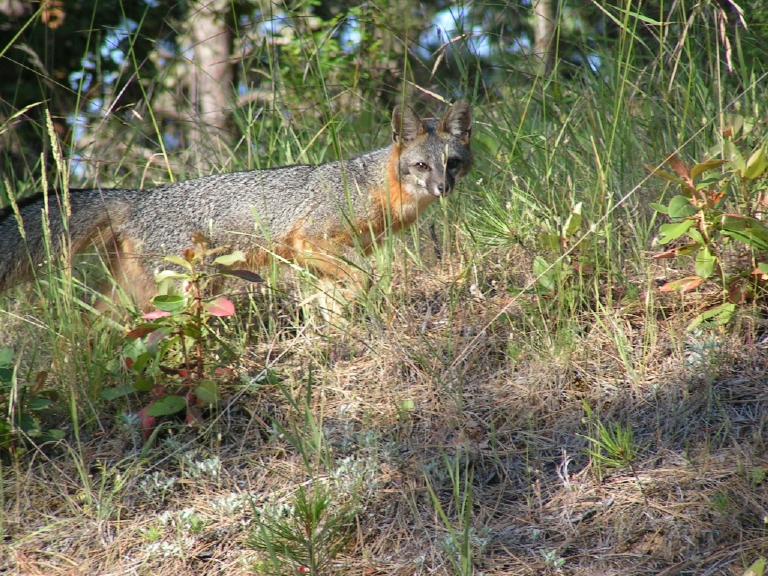 Gray fox (Urocyon cinereoargenteus), being wary of the photographer. Den in a woodpile of yard, scrub woodlands surrounding.