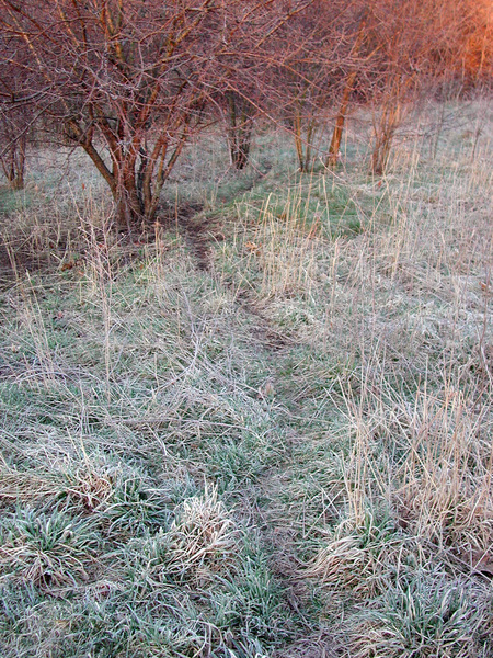 Trail left by deer, rabbit, or woodchucks (trail in center of photo).