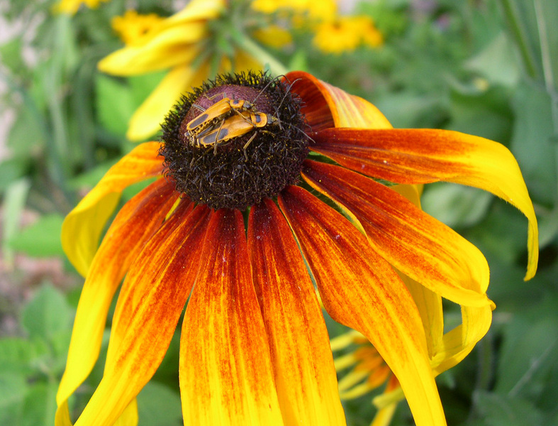 Soldier beetles (Chauliognathus pennsylvanicus) mating on Rudbeckia flowers.