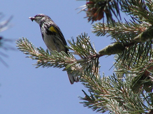 Adult male yellow-rumped warbler with spruce budworm (Dendroica coronata)